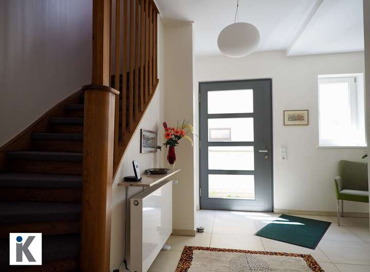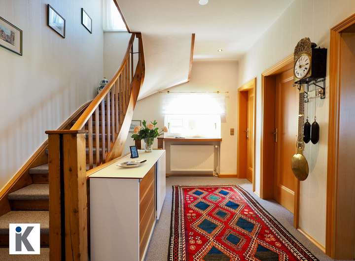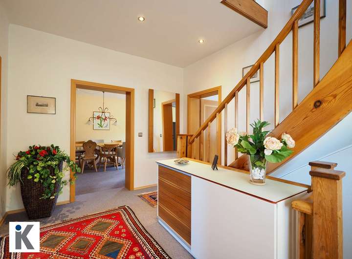 Repräsentativer Eingangsbereich mit stilvoller Holztreppe und Garderobe