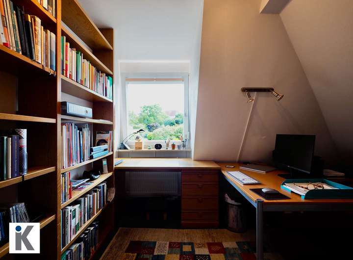 Arbeitszimmer mit Regalwand und Blick ins Grüne