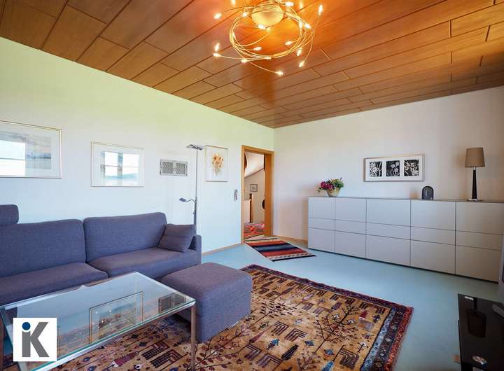 Großzügiges Wohnzimmer mit eleganter Holzdecke und viel Licht