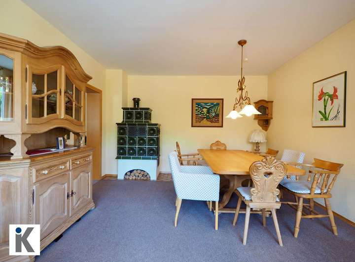 Esszimmer mit traditionellem Kachelofen, ideal für Familienessen