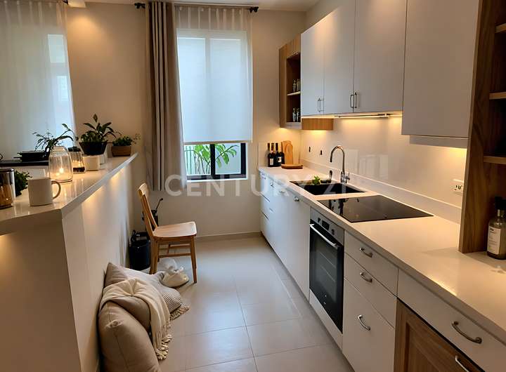 Die Küche ist offen gestaltet und durch einen hochwertigen Granit-Tresen elegant vom Wohnbereich abgeteilt. Sie verfügt über eine gepflegte Einbauküche mit Elektrogeräten und viel Arbeitsfläche.