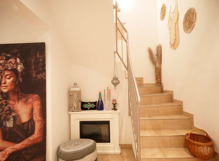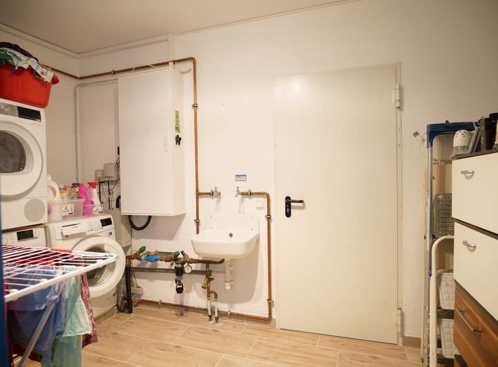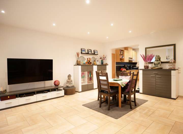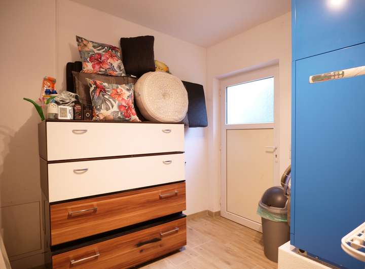 Im Erdgeschoss erwarten Sie ein großzügiges Wohnzimmer mit weitläufiger Fensterfront, hochwertigen LED-Spots in der Decke und direktem Zugang zur mediterranen Terrasse sowie zum Garten, ein modernes Gäste-Duschbad mit WC, ein praktischer Vorratsraum, ein kombinierter Technik- und Hauswirtschaftsraum. Besonders hervorzuheben ist die großzügige Wohnküche mit Einbauschränken samt Elektrogeräten und intelligentem Stauraumkonzept. Der direkte Zugang über die Küche in die Garage und dem dahinter liegenden Technikraum mit Verbindung zur Terrasse sorgt für zusätzlichen Alltagskomfort.