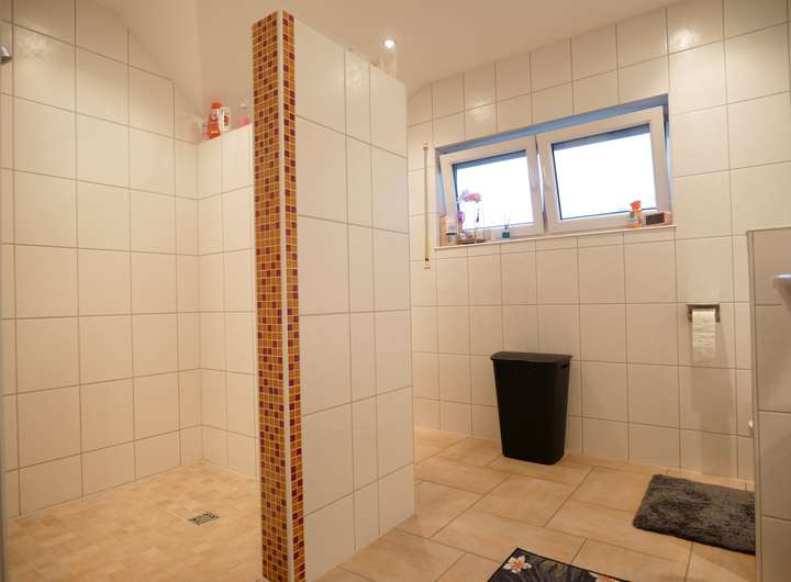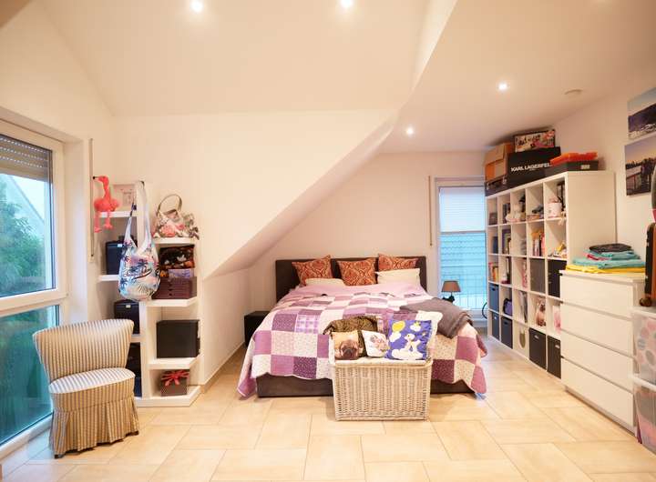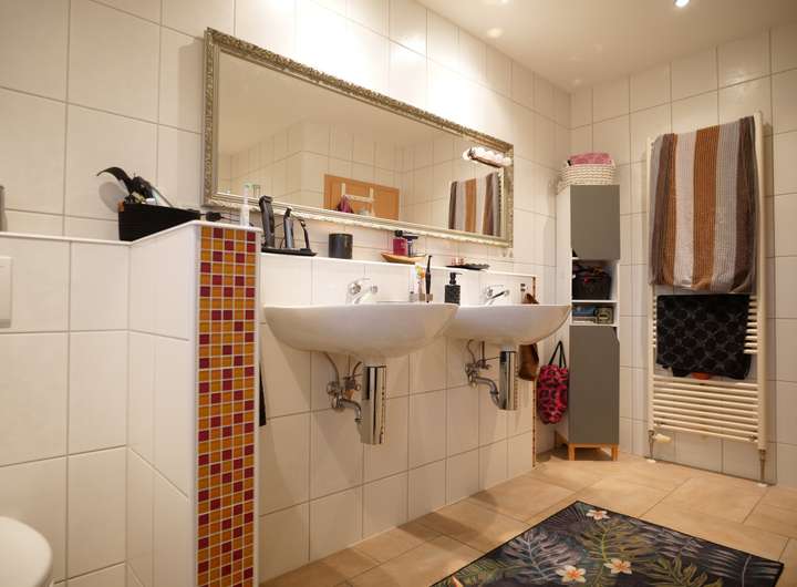 Über eine gepflegte Innentreppe gelangen Sie in das Obergeschoss, das durch seine großzügigen und lichtdurchfluteten Räume besticht. Hier finden Sie ein helles Elternschlafzimmer, ein Kinderzimmer sowie ein weiteres flexibel nutzbares Zimmer, ideal als Büro, Gästezimmer oder Ankleide. Ein großes Tageslichtbad mit pflegeleichter Dusche und zwei Waschbecken rundet diese Etage ab.