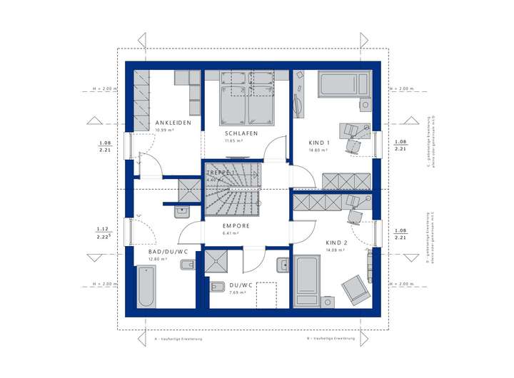 Komfort wird beim EVOLUTION 161 großgeschrieben. Genießen Sie lichtdurchflutete Räume dank großer Fensterfronten, die nicht nur für eine angenehme Atmosphäre sorgen, sondern auch einen herrlichen Blick in den Garten bieten. Ein Balkon oder eine Terrasse kann ebenfalls in das Design integriert werden, sodass Sie Ihre Freizeit im Freien genießen können. Zusätzliche Abstellräume sorgen für Ordnung und Platz für Ihre Dinge, während der optionale Keller zusätzlichen Stauraum bietet.