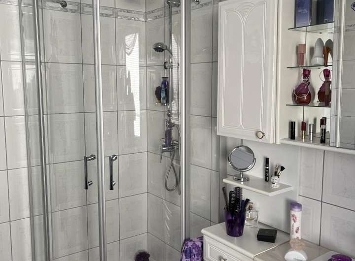 Im Erdgeschoss befindet sich eine Wohneinheit mit drei Zimmern (Wohn- und Essbereich mit Holzkamin, Schlafzimmer, Kinderzimmer), einer Küche (Einbauküche), einem Bad mit Badewanne sowie einer Dusche. Vom Wohnzimmer aus gelangt man auf die überdachte und neu geflieste Terrasse in südwestlicher Ausrichtung.