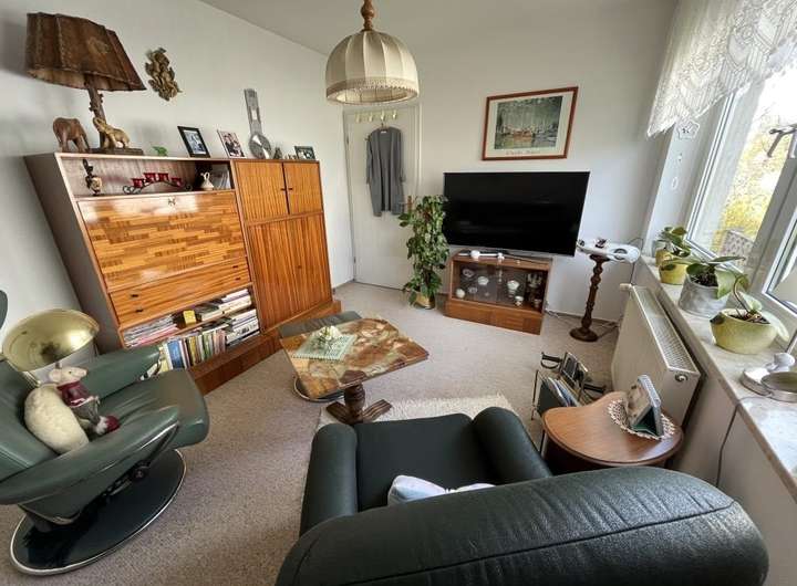Eine Holztreppe führt in das Obergeschoss des Hauses, das die Einliegerwohnung beherbergt. Diese in sich abgeschlossene Wohneinheit, umfasst ebenfalls drei Zimmer und einen Abstellraum. Vom Wohnzimmer aus betritt