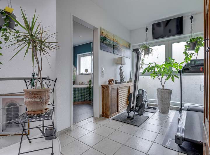 Elektrische Rollläden, Fußbodenheizung, Solaranlage für Warmwasser, Enthärtungsanlage und Glasfaseranschluss sorgen für modernen Wohnkomfort.