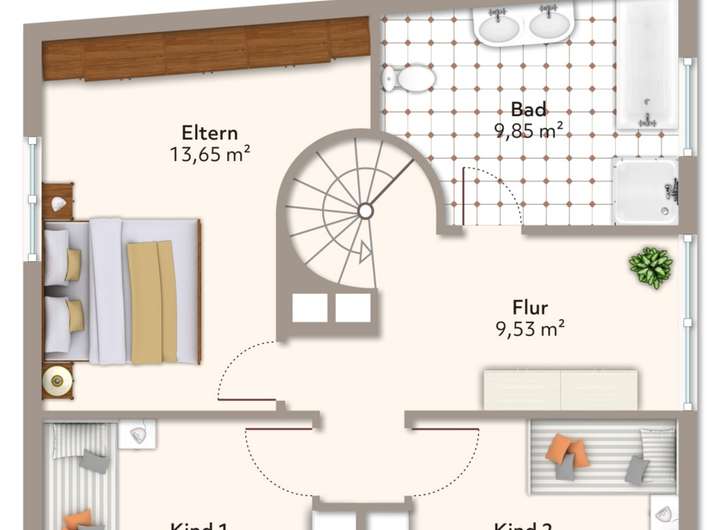 Im Obergeschoss befinden sich drei Schlafzimmer, ein helles Tageslichtbad mit Eckbadewanne und Dusche sowie eine kleine Nische – ideal als Homeoffice oder Leseecke.