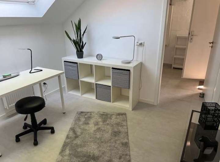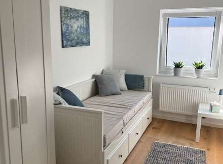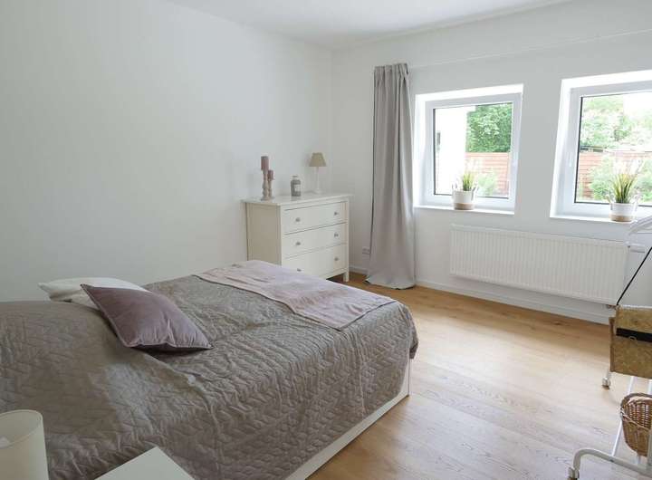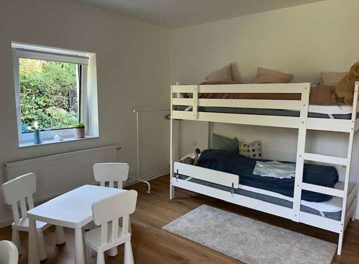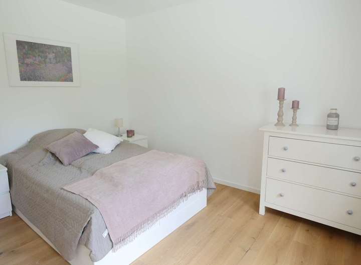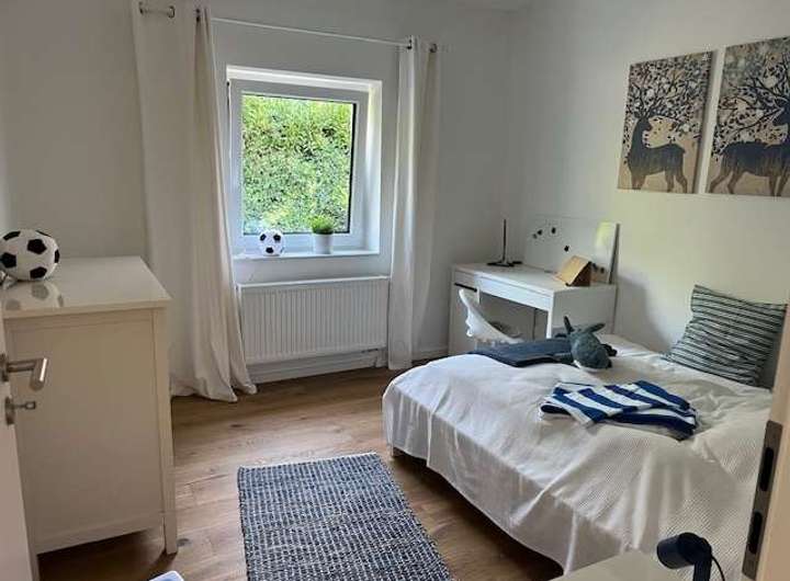 Das Einfamilienhaus hat vier Schlafzimmer. Das große Schlafzimmer ist mit einem Doppelbett, Kommode und einem Kleiderschrank (nicht auf den Bildern zu sehen) eingerichtet. Das zweite und dritte Schlafzimmer sind jeweils mit einem Einzelbett und einem Schrank/Kommode möbliert. Das vierte Schlafzimmer ist mit einem Doppelstockbett, einem kleinen Schreibtisch sowie weiteren Einrichtungsgegenständen ausgestattet. Ein zusätzliches Zimmer mit leichten Dachschrägen ist als Arbeitszimmer vorgesehen und mit einem Schreibtisch eingerichtet. Über diesen Raum kommt man zum Hauswirtschafts- und Vorratsraum, in dem die Waschmaschine und die Heizung des Hauses installiert sind.