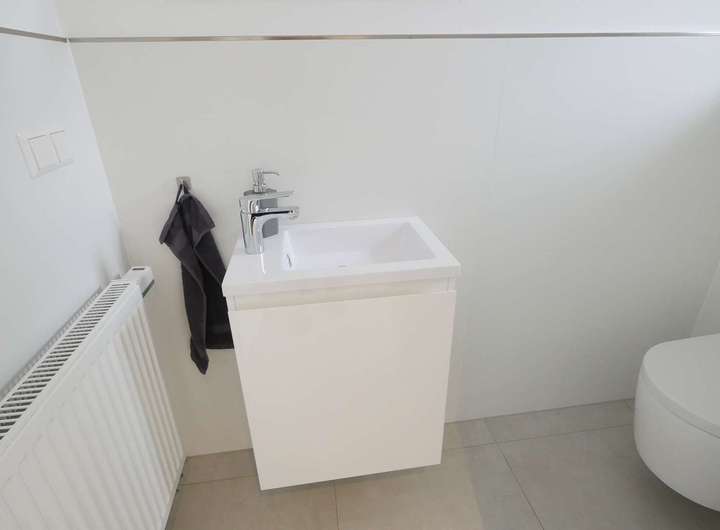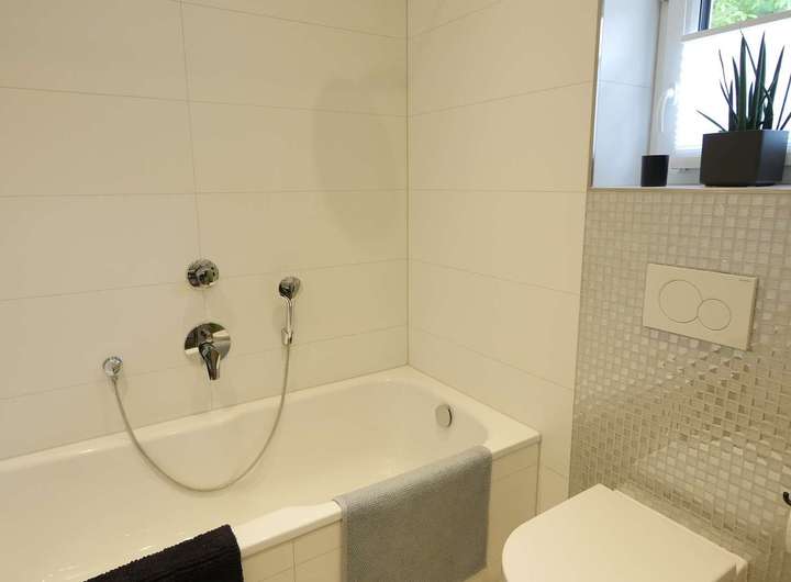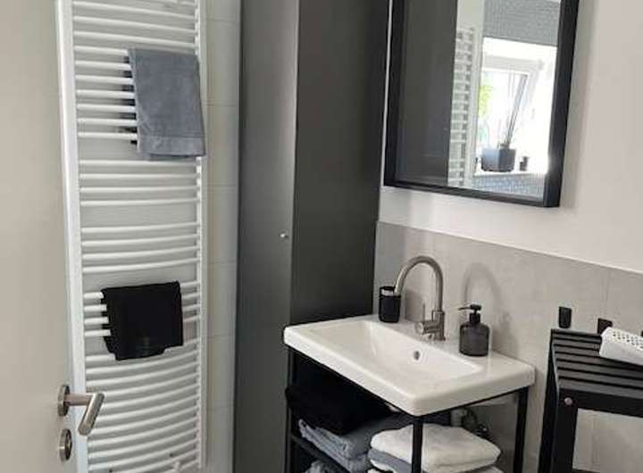 Das moderne Badezimmer ist mit einer Duschwanne, Toilette, Spiegel, Handtuchheizung und einem Unterschrank als Abstellfläche ausgestattet. Ein Fenster sorgt für angenehmes Tageslicht und gute Belüftung.
