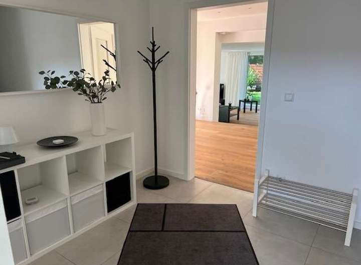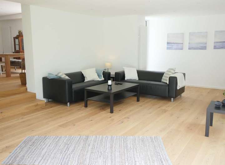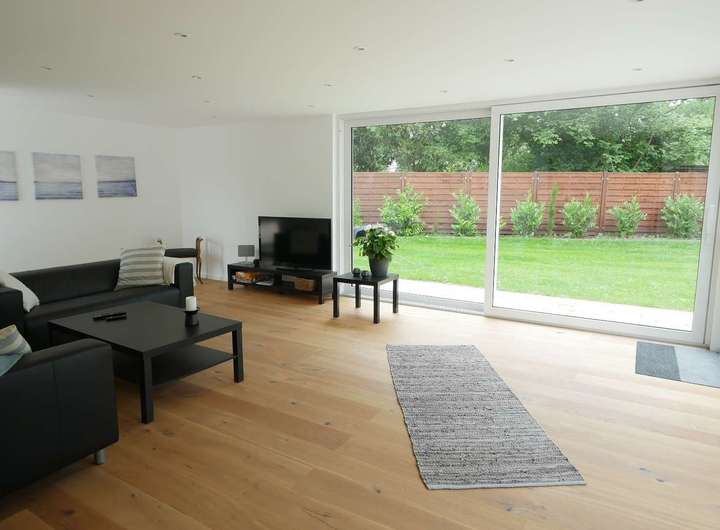 Über den Eingangsbereich mit Gäste-WC kommt man in den großzügig angelegten Wohnraum. Dieser wird zum Garten hin als Wohnzimmer genutzt und ist mit eleganten Möbeln wie einem schwarzes Ledersofa, einem Beistelltisch und ein Fernseher ausgestattet. Große Glasschiebetüren lassen den Raum mit reichlich Tageslicht durchfluten und bieten gleichzeitig einen direkten Zugang zum Garten und der Terrasse.