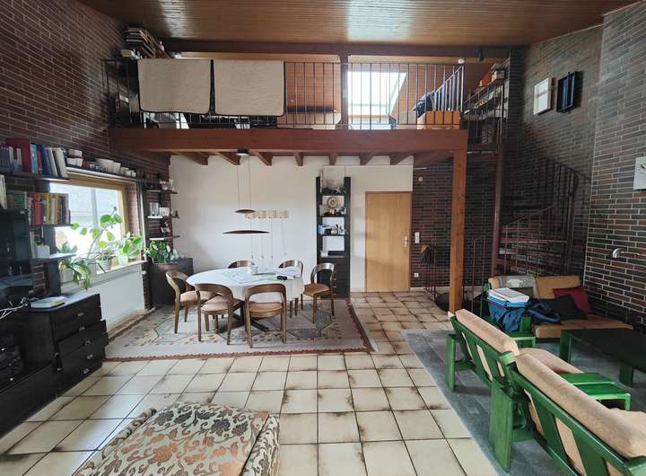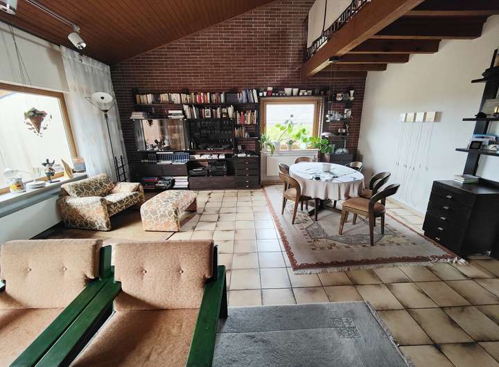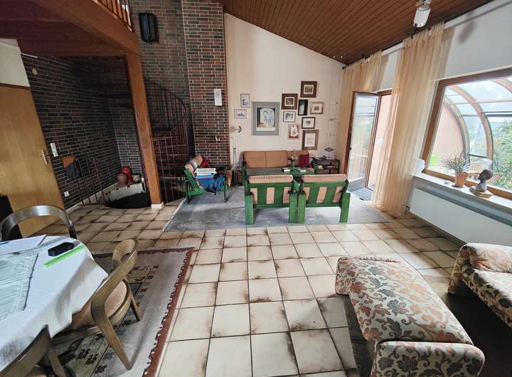 Der großzügige Wohnbereich bildet das Herzstück des Hauses – mit offenem Zugang zur Empore und dem hellen Wintergarten, der einen wunderbaren Blick in den Garten bietet und zu jeder Jahreszeit zum Verweilen einlädt.