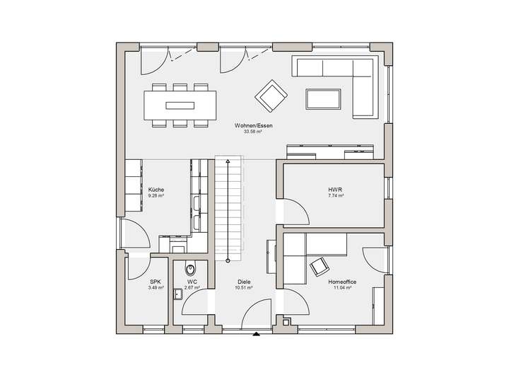 Schon bei dem Eintreten begeistert das Haus mit einem offenen Flur mit Blick in den Wohnbereich, der direkt anschließt. Vorbei an der geraden Treppe beindruckt der Wohnbereich mit vielen bodentiefen Fenstern, die Licht und Helligkeit in den Raum bringen. Gerade das Sofa lädt zu gemütlichen Couchnachmittagen ein. Vom Esstisch öffnet sich der Blick in die geräumige Küche. So ist man auch beim Kochen mitten im Geschehen im Wohnbereich. Ergänzt wird die Küche durch eine Speisekammer, wo Vorräte ihren Platz finden. Außerdem gehört ein Home-Office, ein Gäste-WC und ein Hauswirtschaftsraum zum Erdgeschoss von Haus Fida.