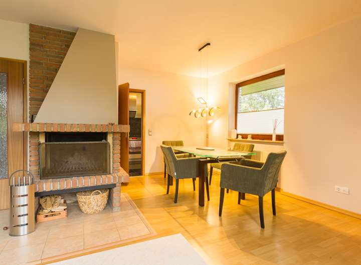 - Wohnzimmer mit Wohnbereich, Essecke und Kamin