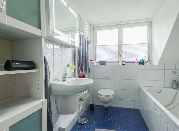 - Vollbad ausgestattet mit Wanne, Dusche und Glasabtrennung, wandhängendem WC, Waschbecken, beheizbarer Handtuchhalter und einem Fenster
