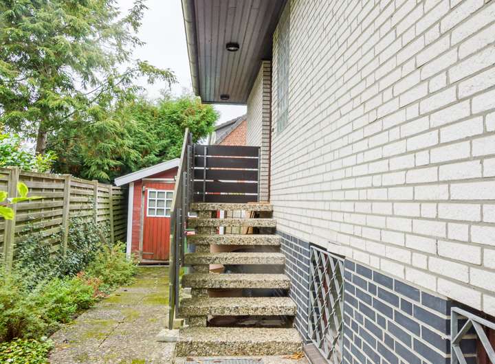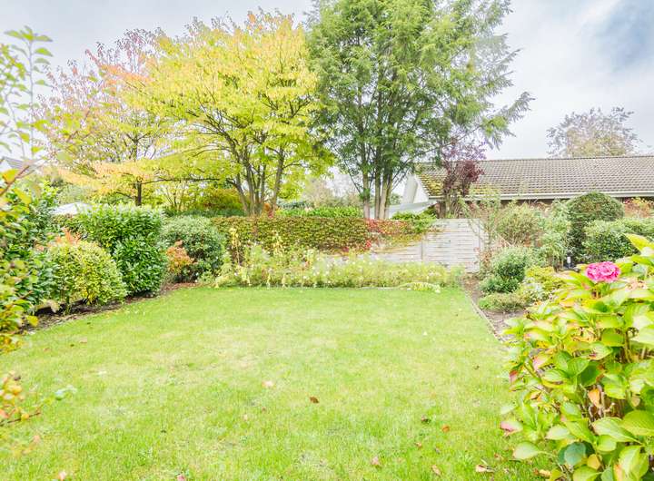 Der Garten erstreckt sich nach vorne und ist pflegeleicht mit Wiese und Ziersträuchern angelegt und lädt zum Gärtnern und Spielen ein. Ihre Gartenutensilien und die Spielgeräte der Kinder können Sie im Gartenhaus verstauen.
