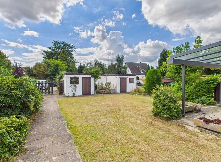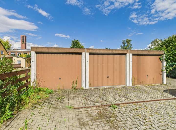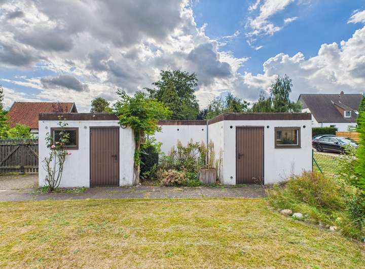 Ebenso dazu gehören 3 Garagen mit Stellflächen davor, die Einblicke in den Garten verwehren, und zwei Geräteräume für Fahrräder oder Gartengeräte.