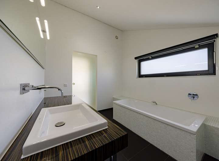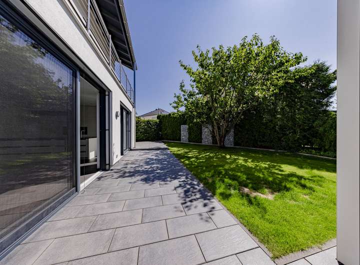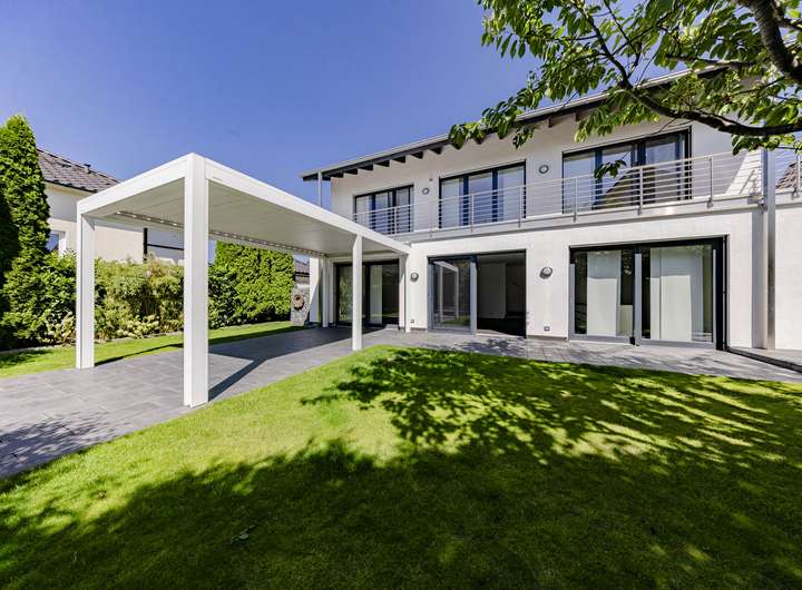 Zusätzlichen Stauraum bieten der Spitzboden und der beheizbare Keller. Das markante Pultdach mit Gründach setzt einen besonderen Akzent. Für Ihre Fahrzeuge stehen ein Carport und vier weitere Stellplätze bereit.