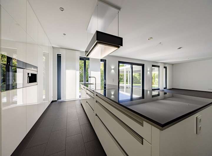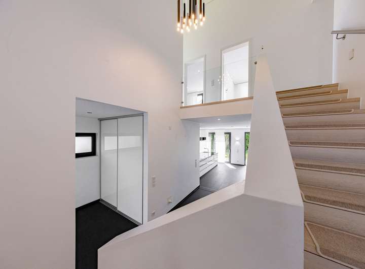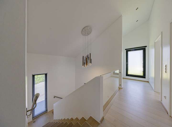 Herzlich willkommen in Ihrem modernen Architektenhaus! Schon beim Betreten empfängt Sie eine helle Diele, die in einen großzügigen, offenen Wohn-, Ess- und Küchenbereich mit Galerie übergeht. Die hohe Decke sorgt für ein besonders luftiges und freundliches Ambiente.