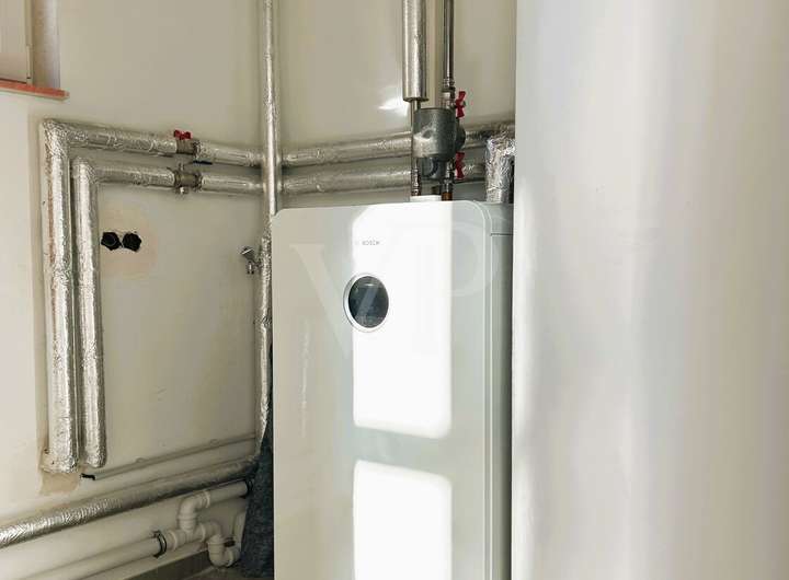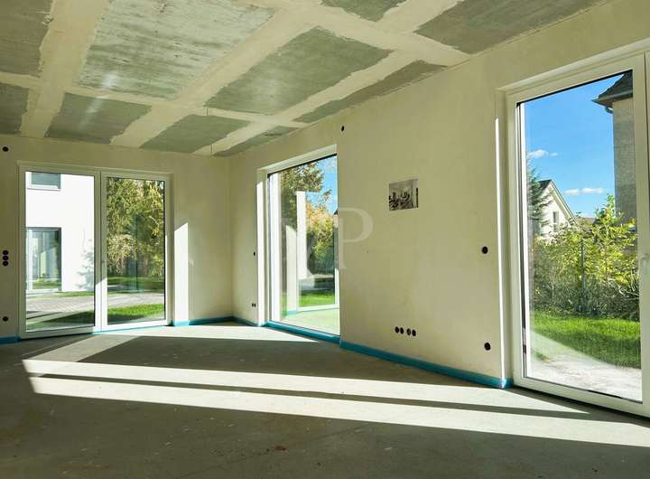 Die Ausstattung und Technik überzeugen durch eine effiziente Wärmepumpe von BOSCH in Kombination mit Solarunterstützung, die eine niedrige Betriebs- und Heizkostenlast sicherstellt. Die Dreifachverglasung der Fenster sorgt für gute Wärmedämmung, während elektrische Außenjalousien eine flexible Licht- und Wärmeregulierung ermöglichen. Für angenehme Wärme sorgt in allen Räumen eine Fußbodenheizung, in allen Zimmern wird Eichenparkett verlegt, das eine hochwertige und langlebige Optik bietet.