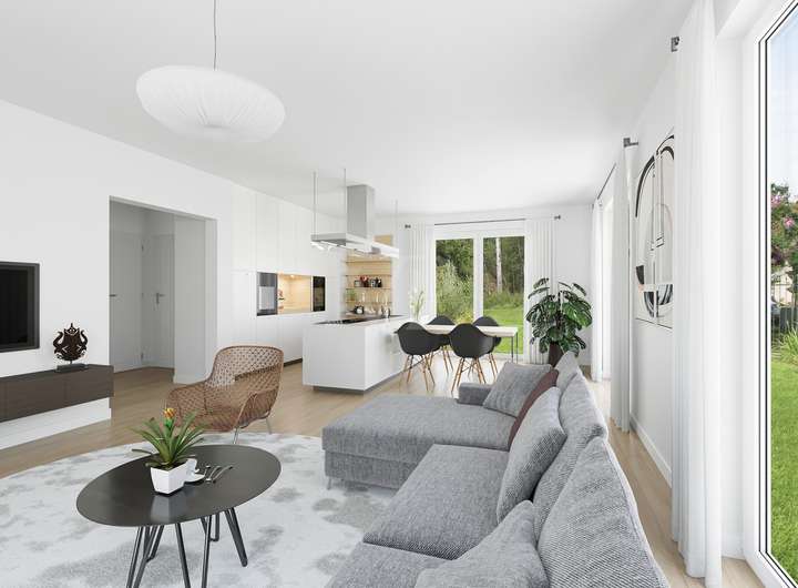 Der großzügige Wohn- und Essbereich bildet das zentrale Herzstück des Hauses und eröffnet direkten Zugang zur offenen Küche. Die Küche lässt sich flexibel konfigurieren: Sie kann bei Bedarf auch in dem an das Wohnzimmer angrenzende Gästezimmer integriert oder als eigenständiger Bereich belassen werden. Im Erdgeschoss befindet sich zudem ein Gäste-WC, das harmonisch in das Gesamtkonzept integriert ist. Im Obergeschoss befinden sich drei geräumige und helle Zimmer, eine Ankleide, die auch als zusätzliches Badezimmer umgestaltetet werden kann sowie ein Badezimmer mit Dusche, Badewanne, WC und Waschtisch. Alle Räume sind großzügig dimensioniert und ermöglichen eine vielseitige Möblierung sowie eine optimale Nutzung der Grundfläche.
