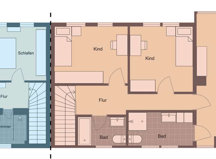 Dachgeschoss: Flur, zwei Badezimmer, Schlafzimmer, zwei Kinderzimmer