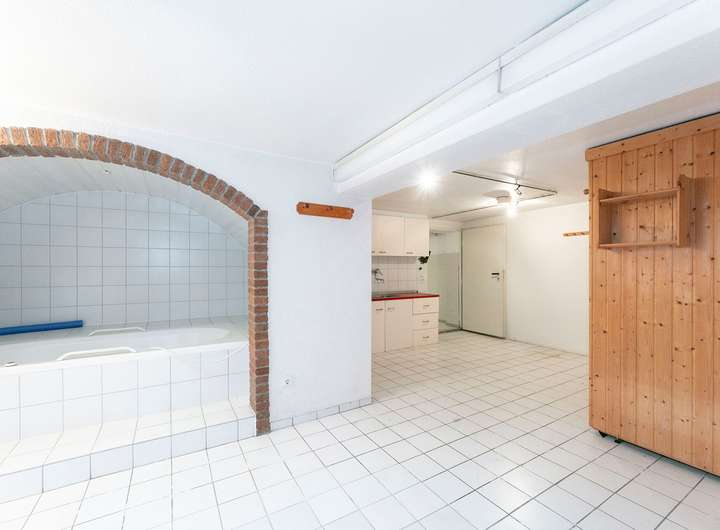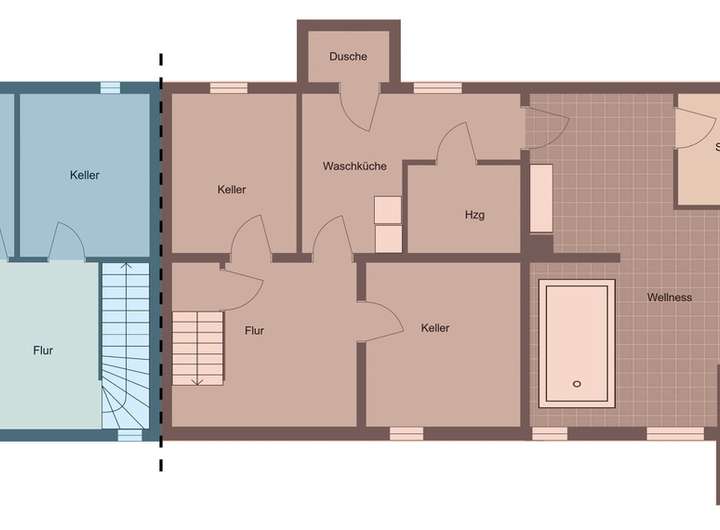 Untergeschoss: Flur, Vorratsraum, Heizungsraum, Wellnessbereich mit Sauna, Whirlpool und Dusche