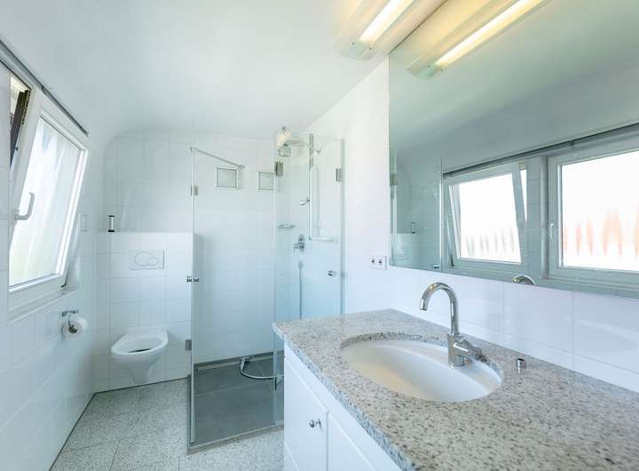 OG: Tageslichtbad mit Dusche, Waschbecken und Toilette
