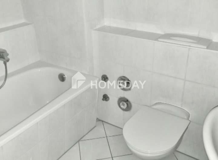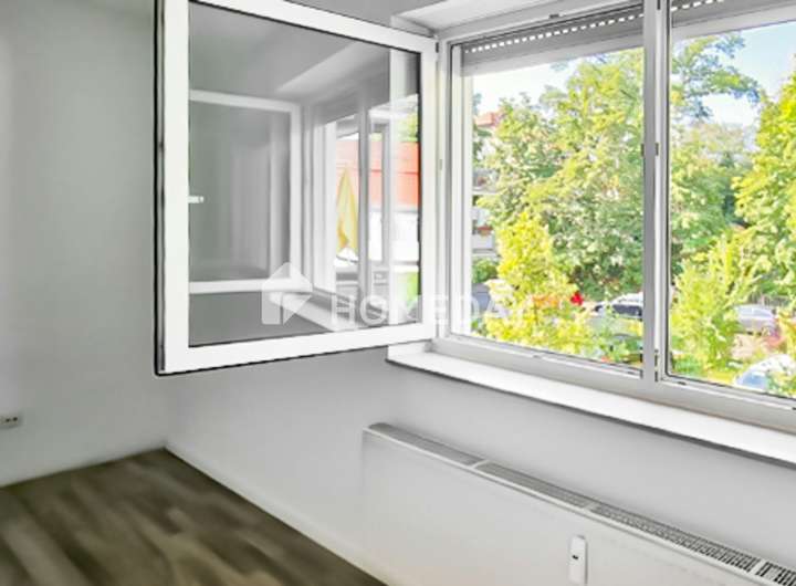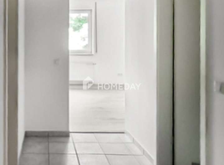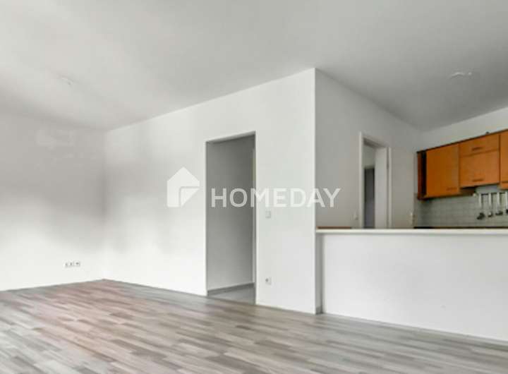Über den zentralen Flur gelangen Sie in alle Räumlichkeiten. Rechterhand öffnet sich das Wohnzimmer, das dank seiner großzügigen Fensterfront von viel Tageslicht durchflutet wird. Die angrenzende offene Küche ist durch einen Tresen geschickt vom Wohnbereich getrennt und fügt sich harmonisch in den Raum ein – ein idealer Platz, um nach Herzenslust zu kochen. Das Badezimmer zeigt sich in klassischem Weiß und überzeugt mit gepflegtem Zustand sowie einer Badewanne, die für entspannte Momente sorgt.