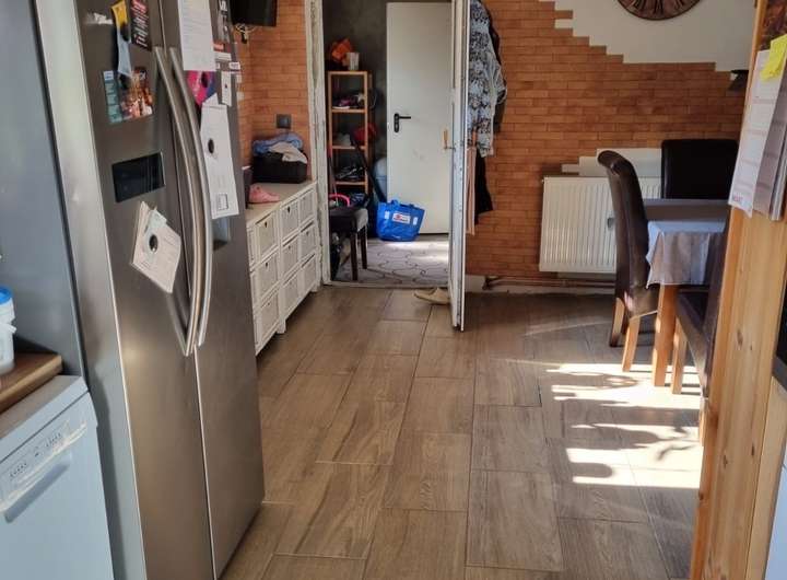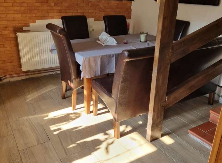 Der Bungalow besticht durch eine moderne und komfortable Ausstattung. Über die Diele gelangen Sie in den großen Essbereich mit offener Küche sowie das angrenzende Wohnzimmer, das mit Echtholzfußboden gestaltet ist. Im Erdgeschoss befinden sich außerdem zwei Kinderzimmer, ein Badezimmer mit Dusche sowie der Heizungsraum.