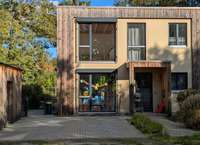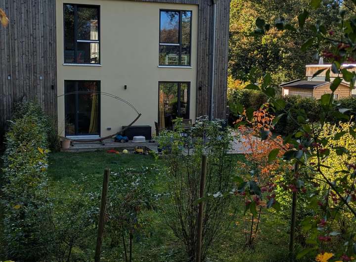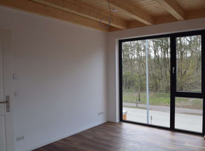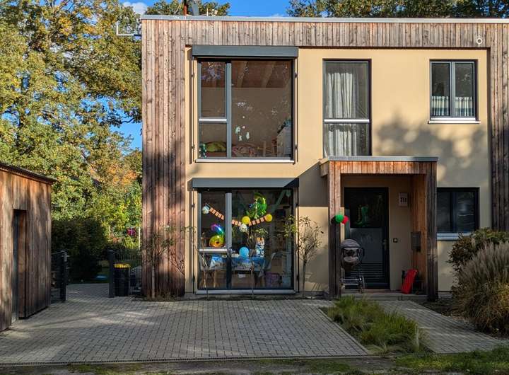 Die moderne energieeffiziente Doppelhaushälfte im ökologischen Holzständerbau errichtet, bietet einen komfortablen Grundriss, helle Räume und den direkten Blick in die Natur.