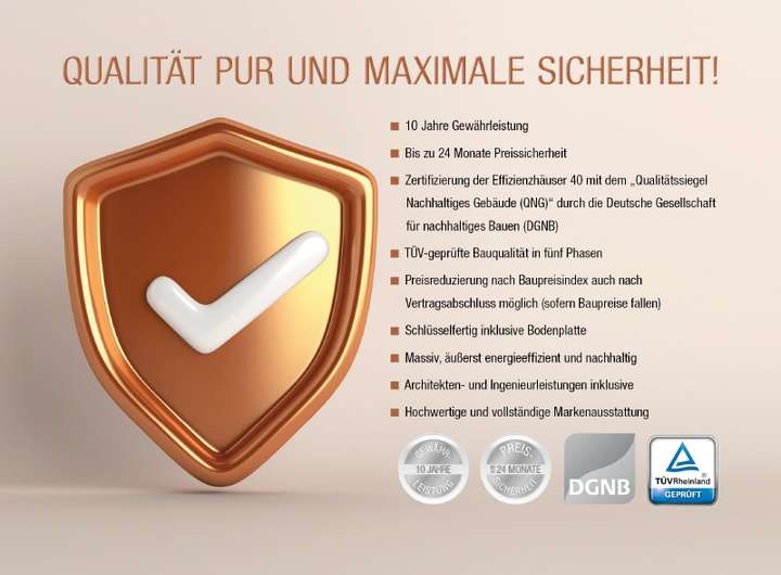 Kern-Haus baut individuelle und massive Architektenhäuser zu einem attraktiven Preis-Leistungs-Verhältnis – und das bereits mit einer Erfahrung seit 1980. Bei Kern-Haus erhalten Sie unter anderem 10 Jahre Gewährleistung auf die wesentlichen Bauleistungen, bis zu 24 Monate Preissicherheit sowie eine dokumentierte 5-Phasen-TÜV-Prüfung während der Bauphase. Jedes Kern-Haus als Effizienzhaus 40 ist bereits QNG-zertifiziert durch die Deutsche Gesellschaft für nachhaltiges Bauen (DGNB).
