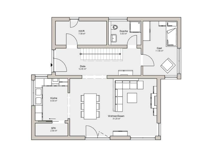 Im Erdgeschoss befindet sich ein großer Wohn- und Essbereich mit Küche und Speisekammer. Gäste wohnen im separaten Zimmer und erfreuen sich an einem eigenen Duschbad. Über die geradläufige Treppe gelangt man ins großzügige Obergeschoss. Hier befinden sich drei Zimmer und das geräumige Badezimmer. Das Elternschlafzimmer mit Blick in den eigenen Garten erhält einen Ankleideraum – Luxus Tag für Tag!