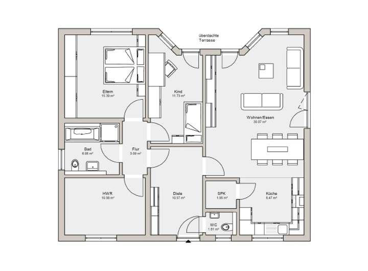 3 Zimmer, offene Küche, Speisekammer, Diele, WC, Flur, Bad, Hauswirtschaftsraum, überdachte Terrasse