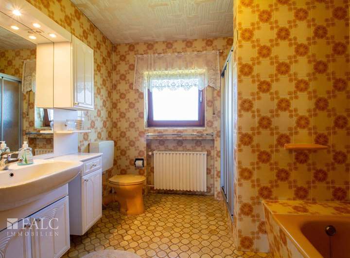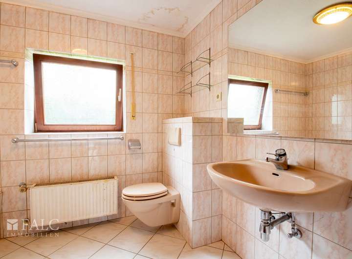 Die Bäder sind aus den 70'er und 80'er Jahren. Sie sind mit farbigen Wandfliesen raumhoch gefliest und sind mit gut erhaltenen Sanitärobjekten ausgestattet.