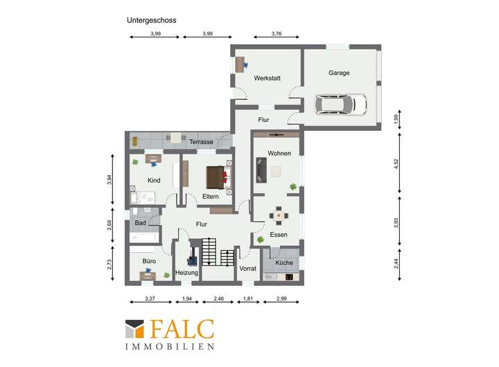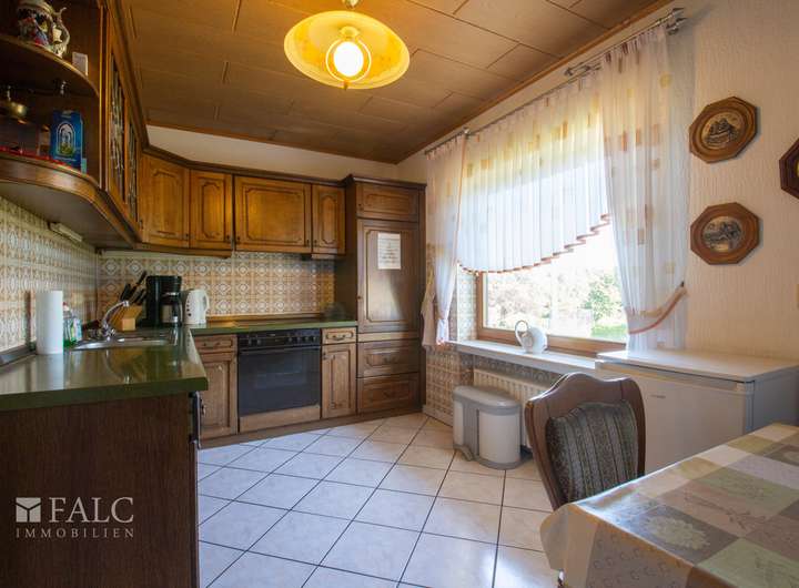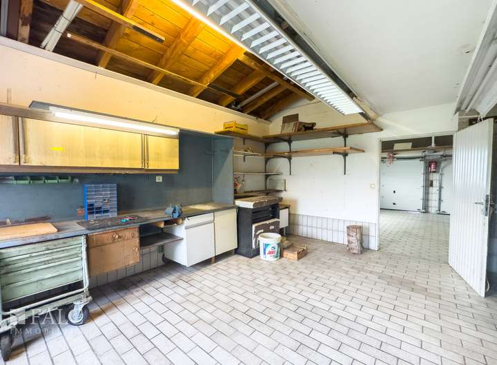 Weiterhin befindet sich im Untergeschoss der Heizungsraum sowie der Zugang zur großen Doppelgarage und Werkstatt. Die beiden letzteren sind hervorragend für einen Handwerker geeignet. Weiterhin kann sogar die Einliegerwohnung als Bürofläche genutzt werden.