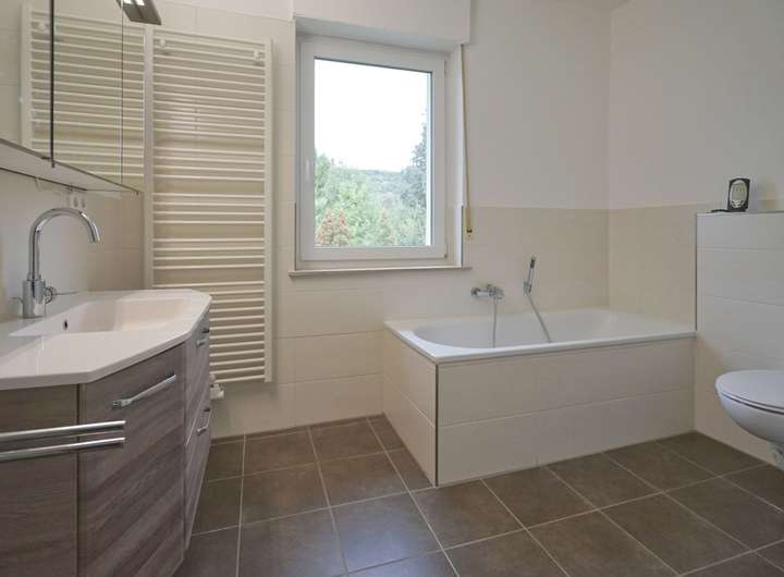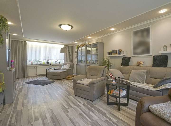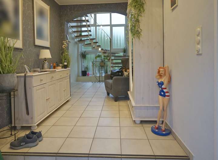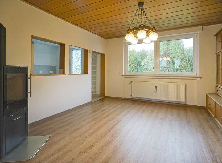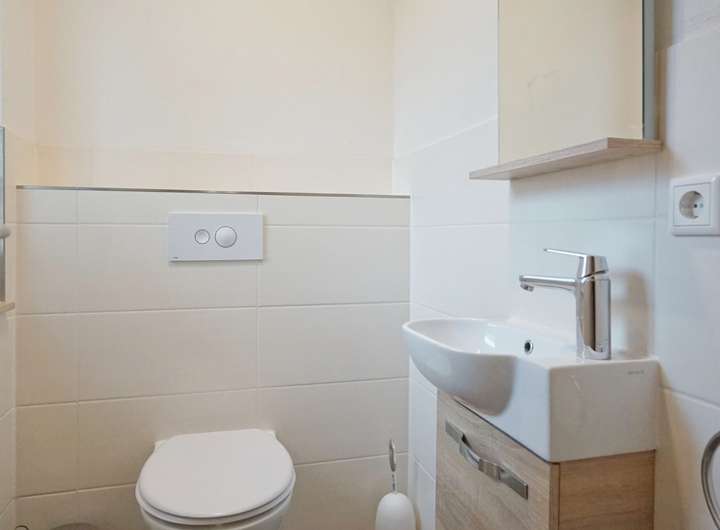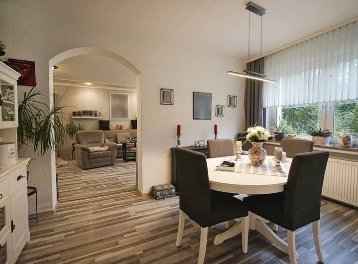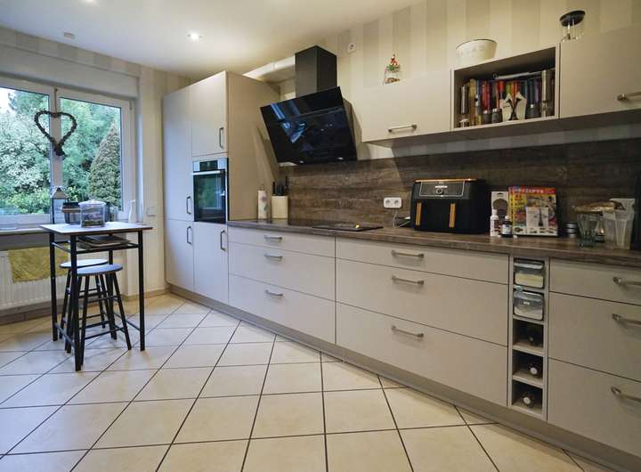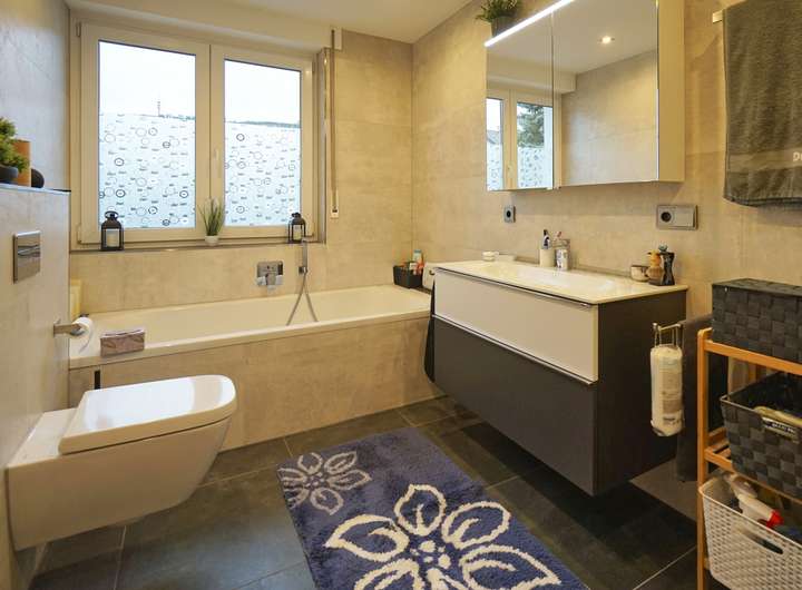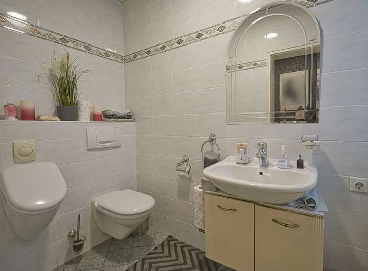 Für Komfort im Alltag sorgen zwei Gäste-WCs, zwei Bäder mit Dusche und Wanne sowie eine vorhandene Einbauküche. Die Bodenbeläge aus Laminat, Fliesen, Parkett und Teppich unterstreichen den wohnlichen Charakter. Im Dachboden gibt es zusätzlichen Stauraum.