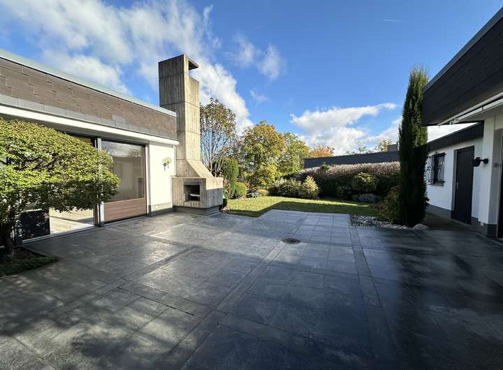 - Terrasse mit Markise und gepflegter Garten