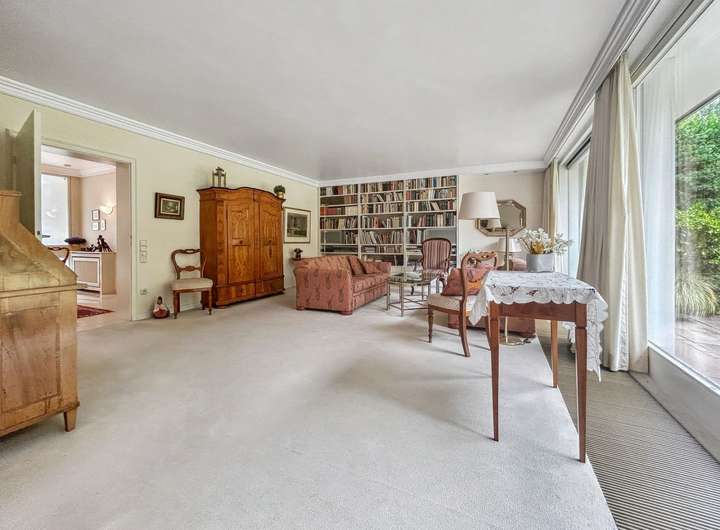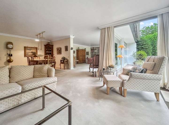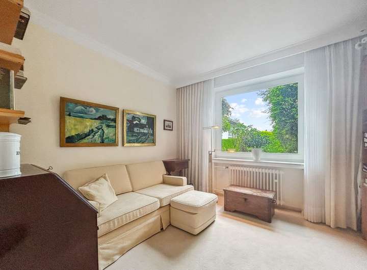 Vom Wohnzimmer aus haben Sie direkten Zugang zur Terrasse und in den charmanten Garten – ein echtes Highlight für Gartenliebhaber oder Familien mit Kindern.