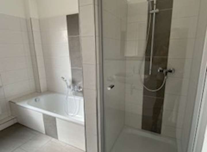 Fußböden sind mit Fliesen ausgelegt, das Bad verfügt über Dusche und Badewanne.