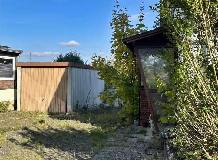Der Garten ist gut geschnitten und bietet viel Platz für individuelle Gestaltung, benötigt jedoch etwas Pflege. Eine Garage sowie ein zusätzlicher Stellplatz befinden sich ebenfalls auf dem Grundstück.