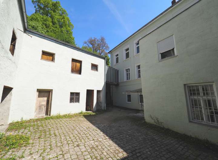 Denkmalgeschützte Nebengebäude mit Garagen, ein Innenhof und ein Gewölbekeller runden das Ensemble ab.