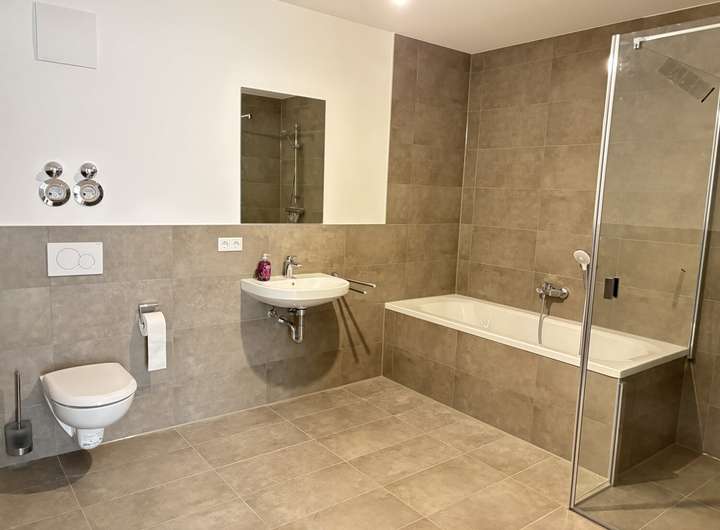 Das Hauptschlafzimmer überzeugt durch seine angenehme Größe, während ein weiteres Zimmer flexibel als Kinder-, Arbeits- oder Gästezimmer genutzt werden kann. Das stilvolle Tageslichtbad verfügt über eine bodengleiche Dusche, elegante Armaturen und geschmackvolle Fliesen.