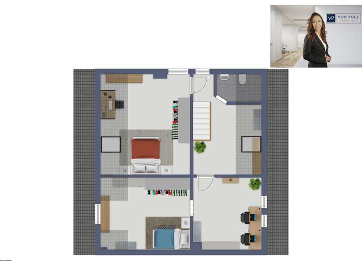 Das ausgebaute Dachgeschoss bietet zusätzlichen flexiblen Raum: Es gliedert sich in einen Flur und drei weitere Zimmer, wobei eines davon ein Durchgangszimmer ist. Diese Räume sind perfekt für Home-Office, Hobby oder als Gästezimmer.