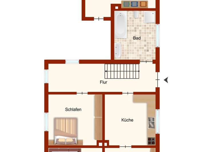 Insgesamt stehen Ihnen ca. 120 m Wohnfläche auf zwei Ebenen zur Verfügung. Im Erdgeschoss befindet sich ein großes Wohnzimmer, ein Schlafzimmer, eine Küche sowie ein Badezimmer mit Dusche.