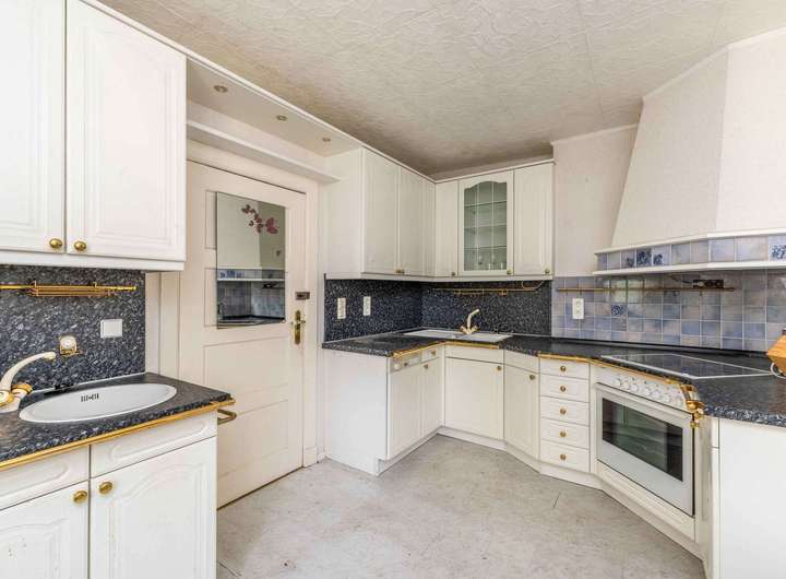 Das Anwesen verfügt über zwei Eingänge, die im Hochparterre in das Haus führen. Das Erdgeschoss bietet eine Küche, die das Herzstück dieser Etage bildet. Ergänzt wird sie durch ein tagesbelichtetes Gäste-WC unter der Treppe sowie drei Zimmer, von denen eines mit einem gemütlichen Kamin ausgestattet ist. Von hier aus besteht ein direkter Zugang zum Anbau.