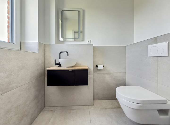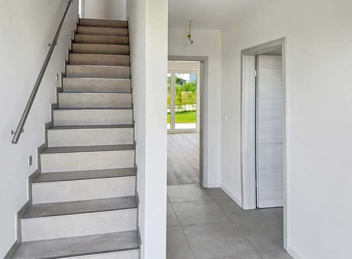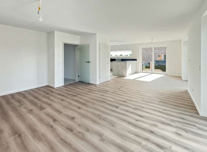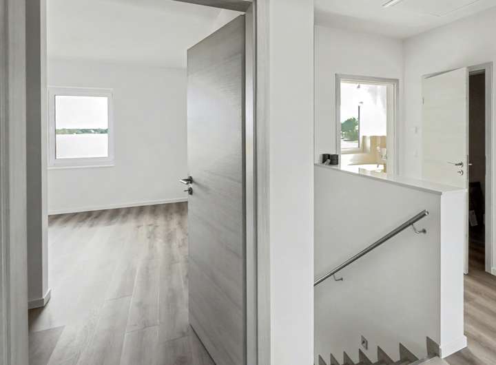 Sämtliche Räume sind mit einer Fußbodenheizung ausgestattet und mit Vinylboden und Feinsteinzeugfliesen sowie verputzten, weiß gehaltenen Wänden gestaltet, die dem Interieur eine moderne und zugleich zeitlose Eleganz verleihen. Jede Haushälfte verfügt über eine eigene Erdwärmepumpe und entspricht somit der Energieklasse A+.