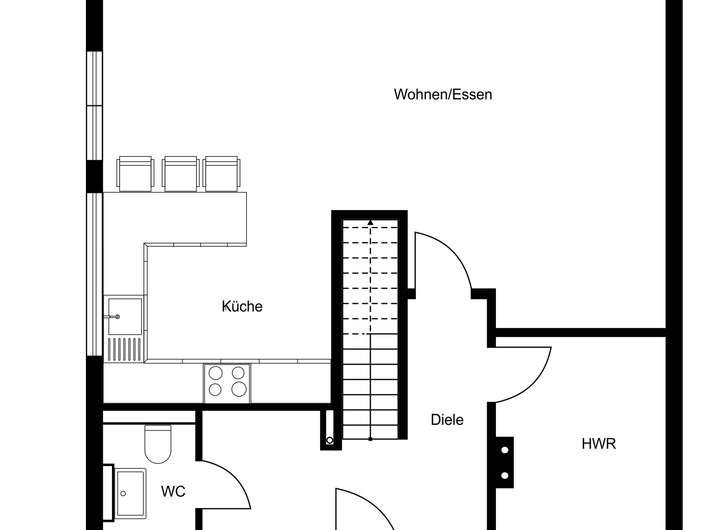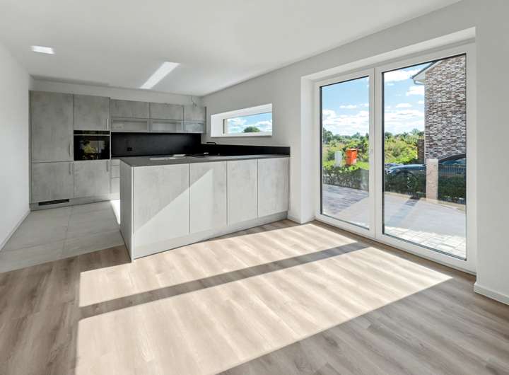 Schon beim Betreten spürt man die besondere Atmosphäre des Neubaus. Der großzügige Wohn- und Essbereich im Erdgeschoss bildet das Herzstück des Hauses. Große Fensterfronten lassen viel Tageslicht herein und schaffen eine freundliche, offene Wohnatmosphäre. Der fließende Übergang in die moderne Markeneinbauküche mit Backofen, Induktionskochfeldern, Mikrowelle, Geschirrspülmaschine und Kühlschrank lädt zum gemeinsamen Kochen und Genießen ein. Ergänzt wird das Erdgeschoss durch ein geschmackvolles Gäste-WC und einen praktischen Hauswirtschaftsraum, der zusätzlichen Stauraum bietet und den Alltag erleichtert.