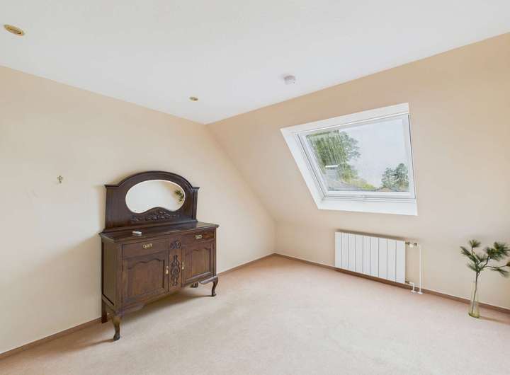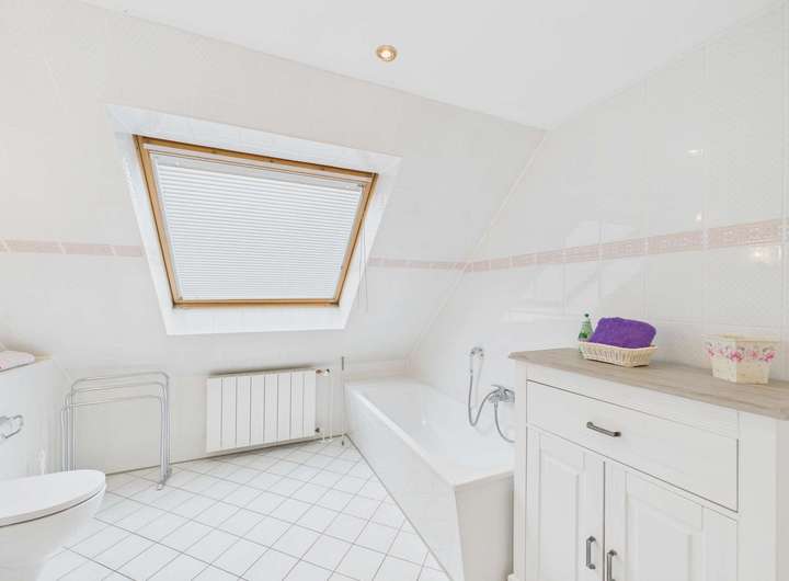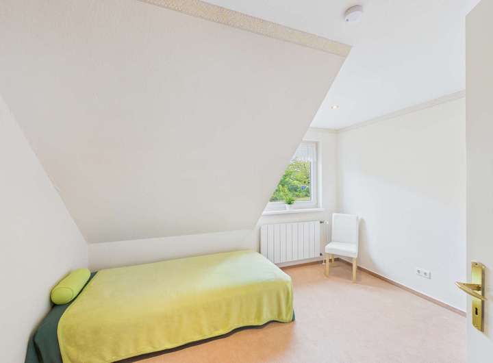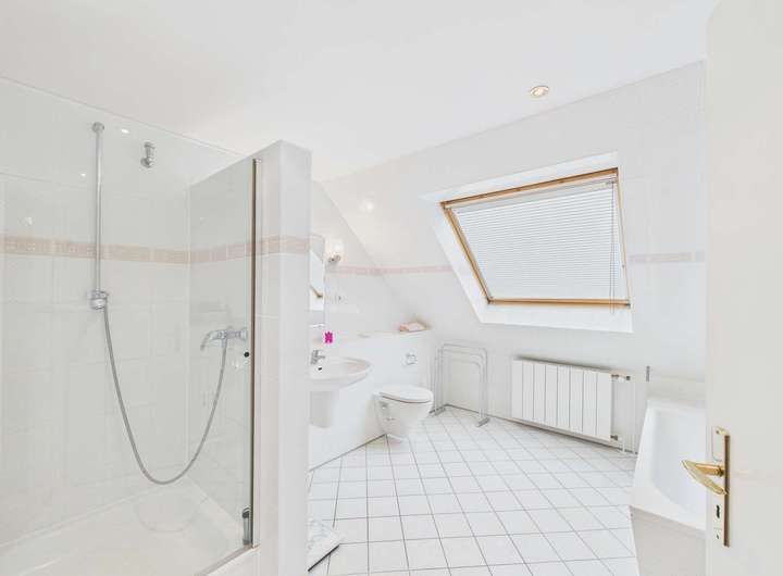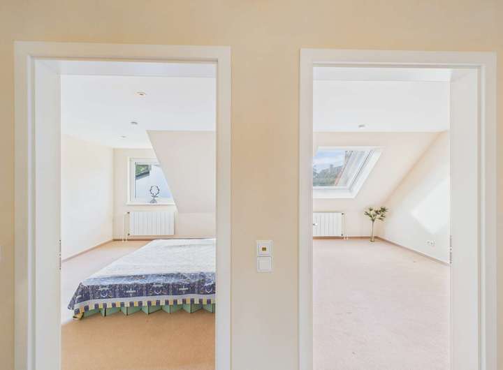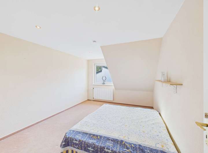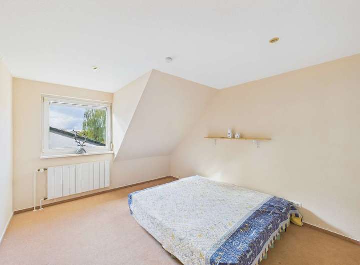 Im Obergeschoss stehen drei Zimmer, ein großes Bad und eine Abstellkammer zur Verfügung. Durch die Gauben sind die Räume großzügig geschnitten.