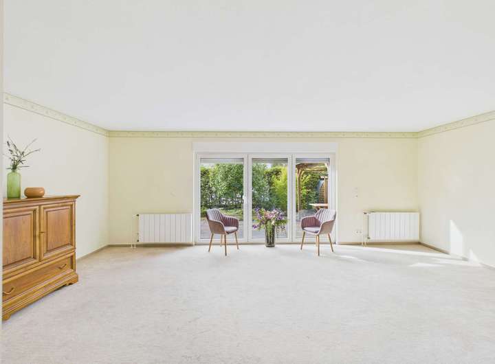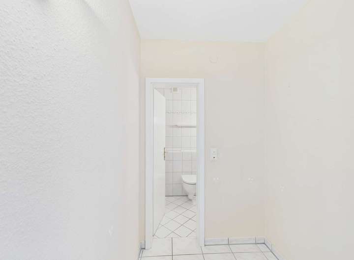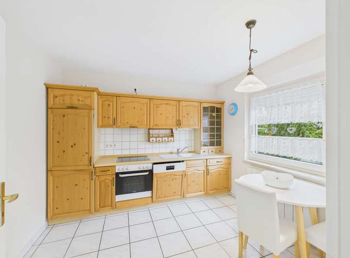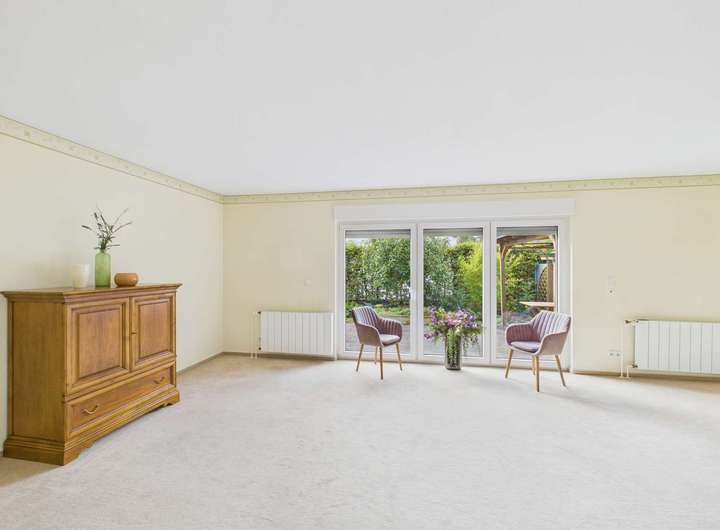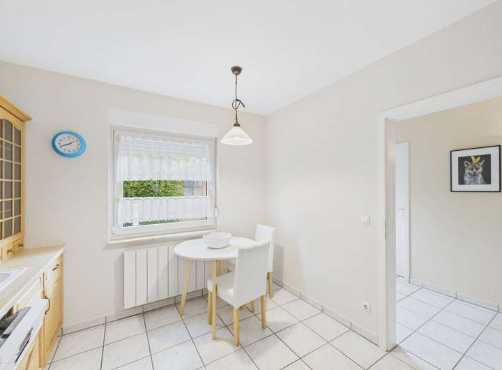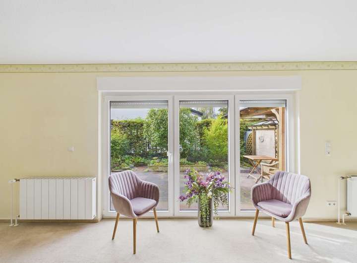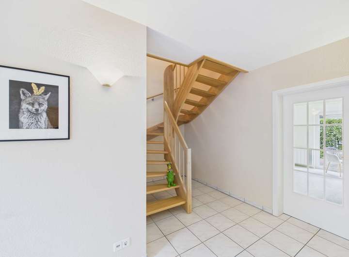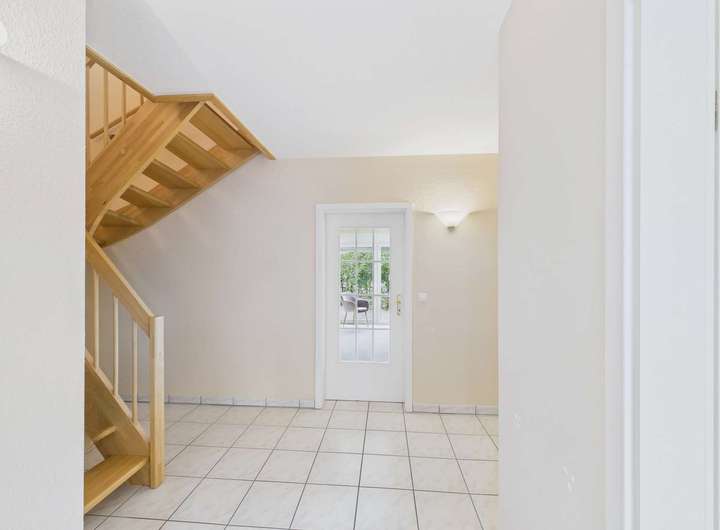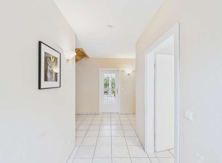 Im gleich links im Eingangsbereich ist der Hauswirtschaftsraum mit allen technischen Anschlüssen auch für die Waschmaschine. Auf der rechten Seite geht es in die Küche. Am Ende des Flures befindet sich das Wohnzimmer. Rechts davor ist ein kleiner Flur für die Garderobe. Hier haben Sie auch das Gäste-WC. Das Wohnzimmer bietet viel Platz für den Wohn- und Essbereich. Die große Fensterfront mit bodentiefen Terrassentüren ist der direkte Zugang zur Terrasse und in den kleinen Garten.
